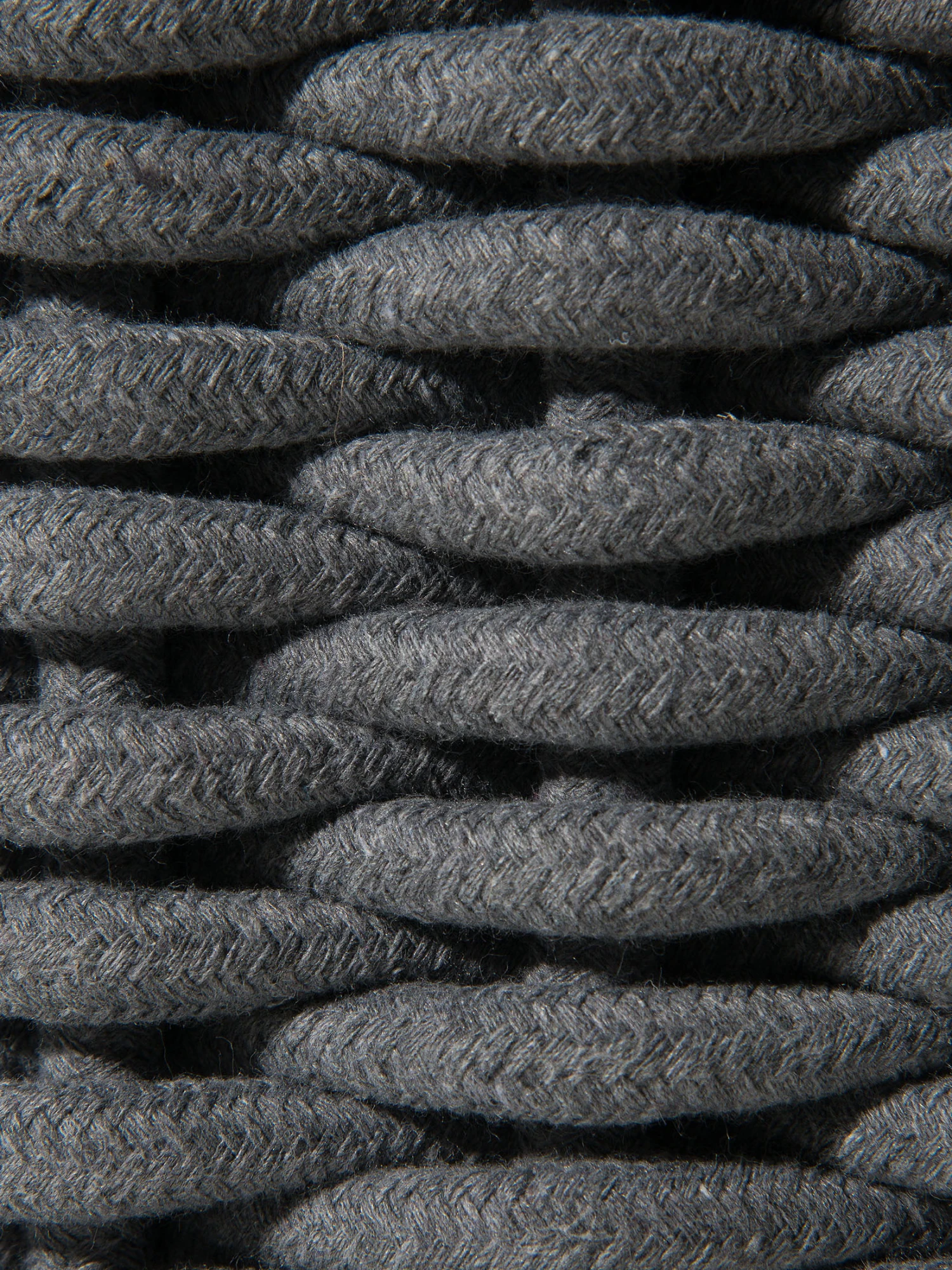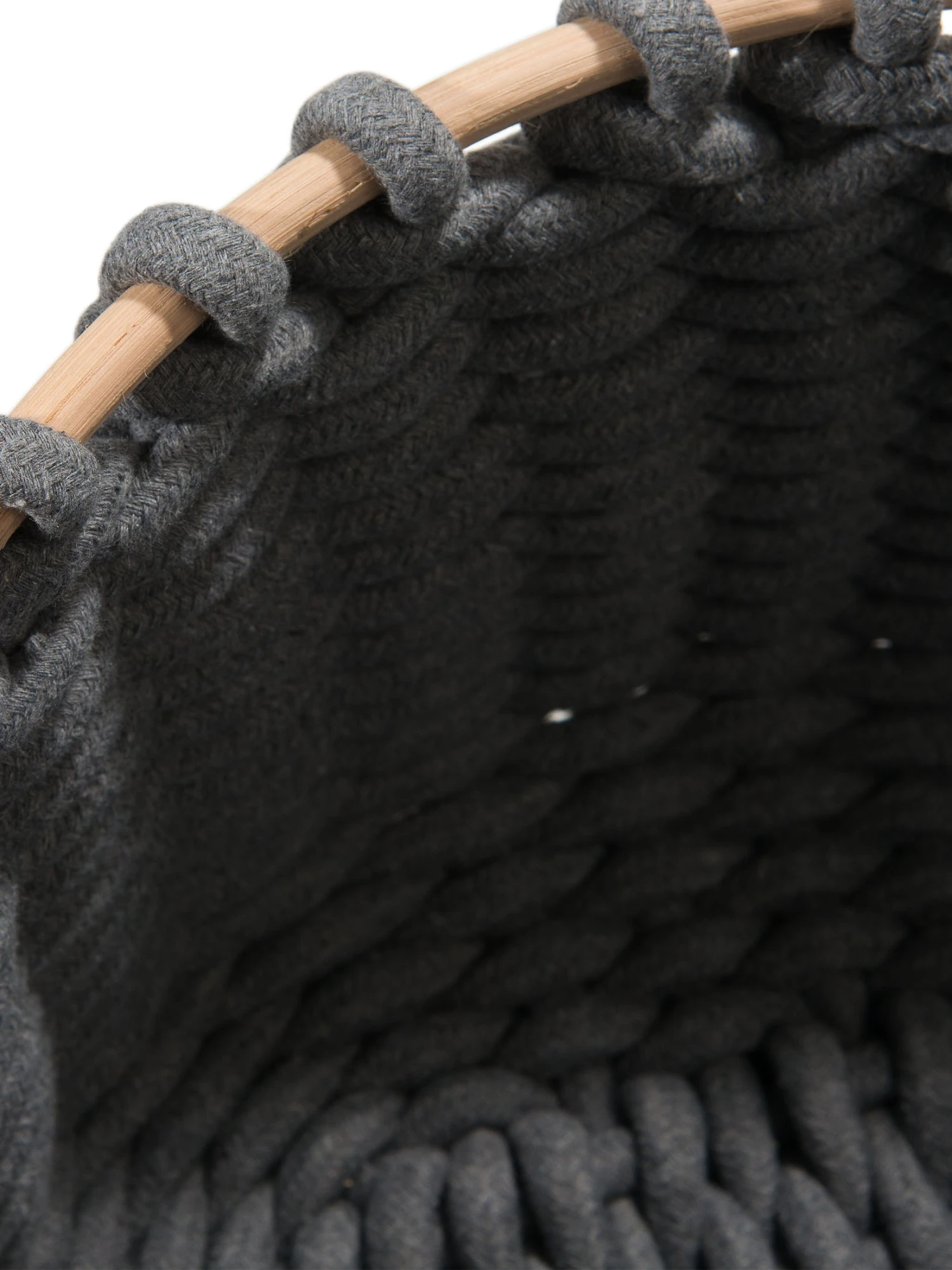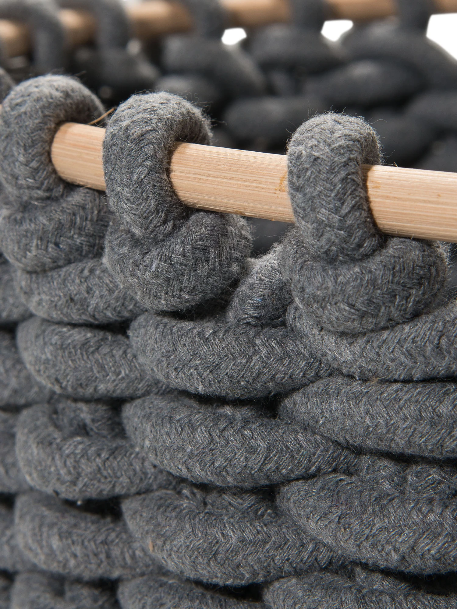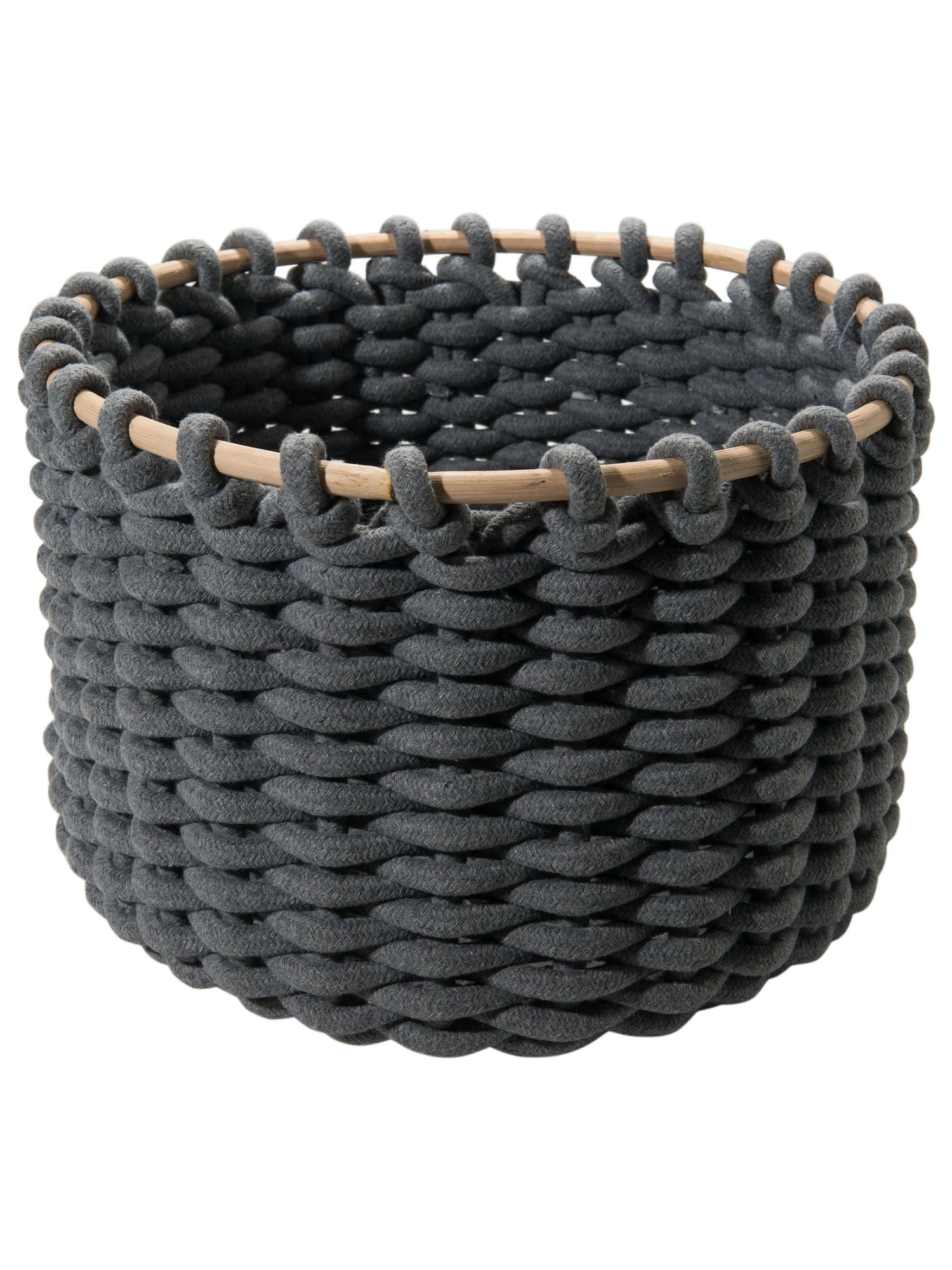 Attraktiver runder Korb. Kordel aus Baumwolle und Polyester wird über einen Rattanring geflochten.