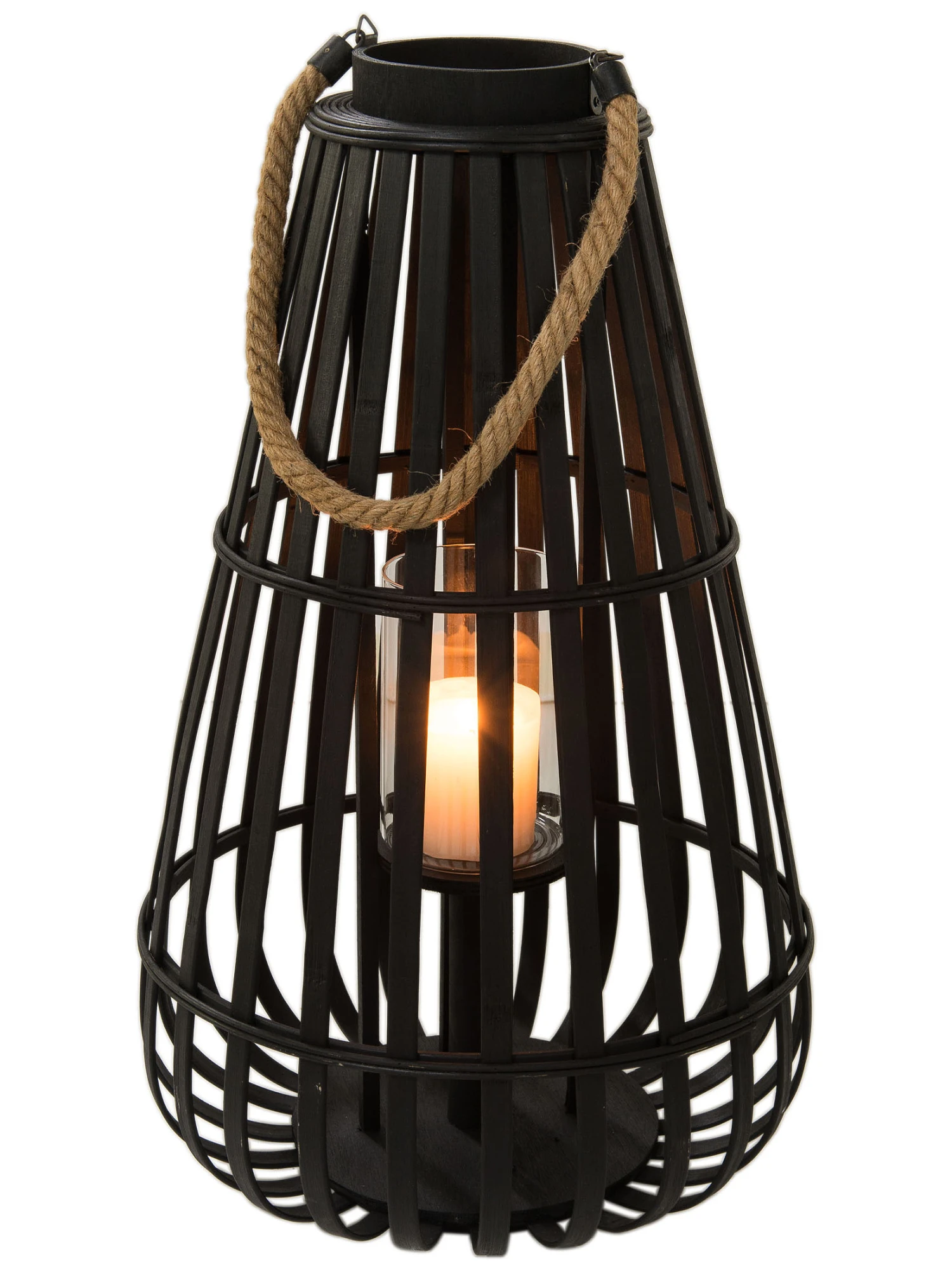 Elegante Bambus-Laterne in stilischem schwarz. Mit Henkel und Glaseinsatz.
