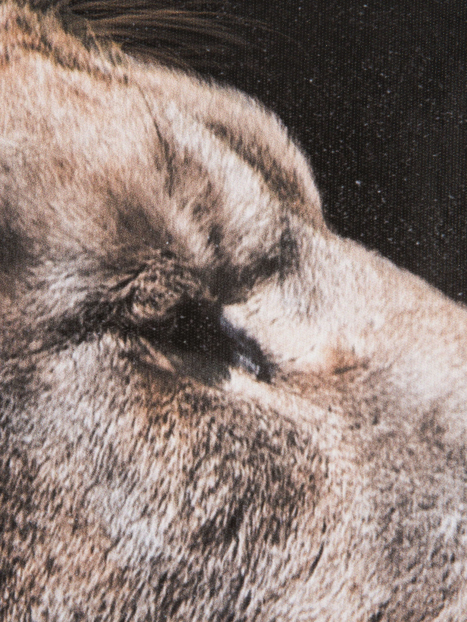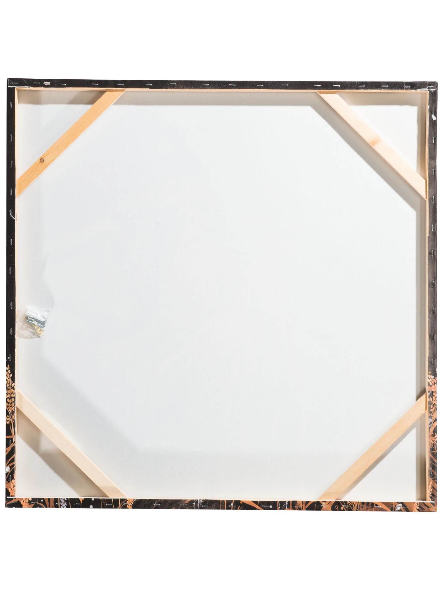 Majestätisches Löwen-Motiv vor dunklem Hintergrund auf Leinwand. Gras aus Goldfolie.