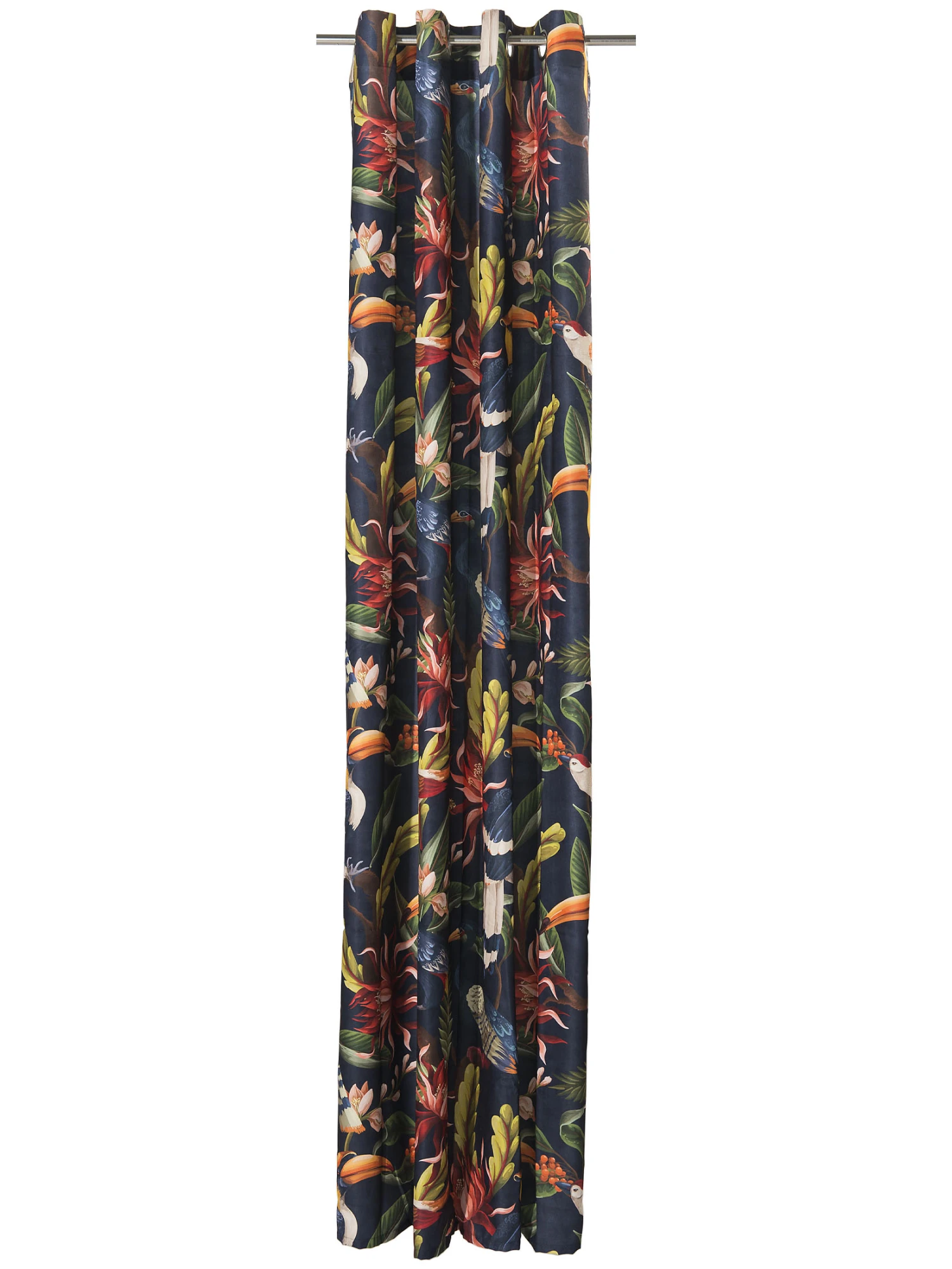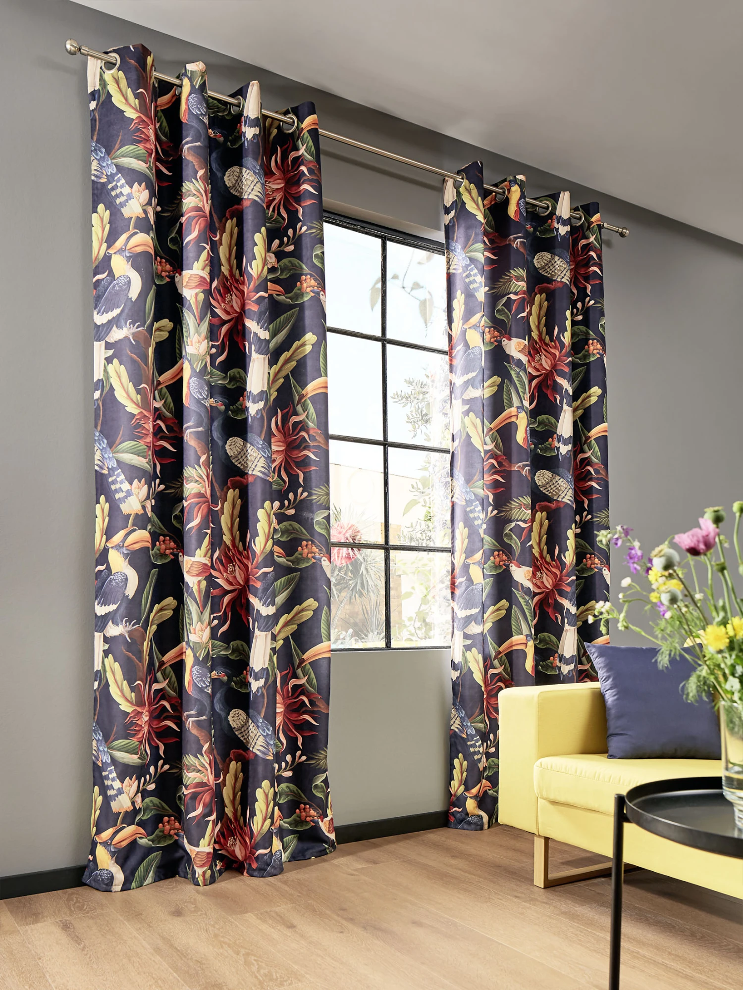 Welcome to the Jungle! Dieser Fertigschal mit silbernen Ösen ist ein absoluter Eye-Catcher. Das ausdrucksstarke Dschungel-Muster auf dunklem Hintergrund ist ein Trendprodukt für Fans der maximalistischen Einrichtung. Dieser Vorhang ist nicht transparent und kann den Wohnraum entsprechend abdunkeln. Tucani ist aus 100 % Polyester (PES) hergestellt, ist pflegeleicht und bei 30 °C waschbar.