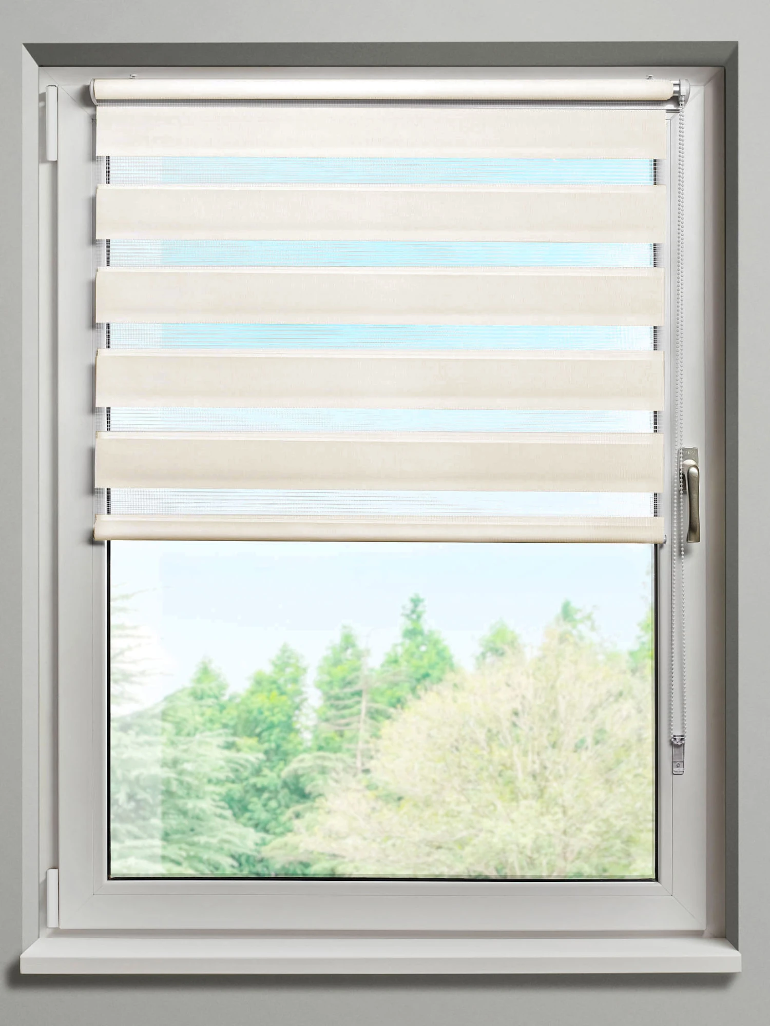 Beim DUO STARLIGHT liegen zwei Stoffbahnen übereinander, die wiederum transluzente und blickdichte Streifen haben. Je nach Stellung der Bahnen zueinander können Sie den Lichteinfall regulieren. Hierzu bedienen Sie ganz einfach den Kettenzug. Für die bohrfreie Montage am Fensterrahmen werden praktische Klemmträger mitgeliefert. Zusätzlich sind Clips für die Deckenmontage im Lieferumfang enthalten.