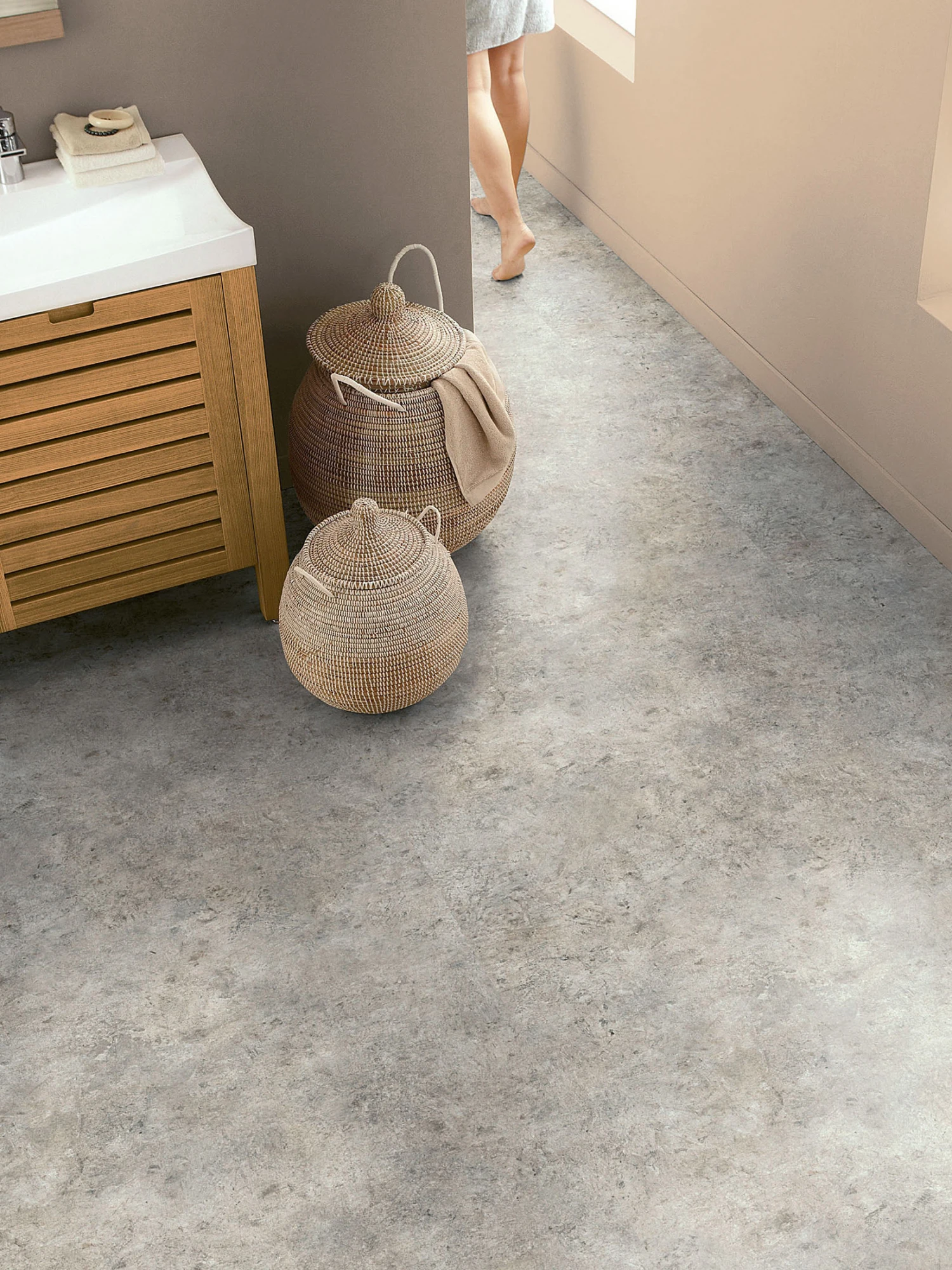 Sichtbeton heißt Sichtbeton, weil man ihn sehen soll: Beton zu zeigen, ist modern. Mit dem Vinylboden STYLE kommt der angesagte Betonlook ganz einfach von der Rolle. Die unregelmäßige Struktur aus Grau- und Beigetönen ist ein spannender Hingucker und passt wunderbar zum natürlichen, puren Einrichtungsstil. Etwa 2,4 mm starkes Material mit eingebauter Trittschalldämmung und rutschhemmender Oberfläche, für Fußbodenheizungen und höhere Beanspruchung geeignet (Nutzungsklasse 31). 100 % recycelbar, phtalatfrei.