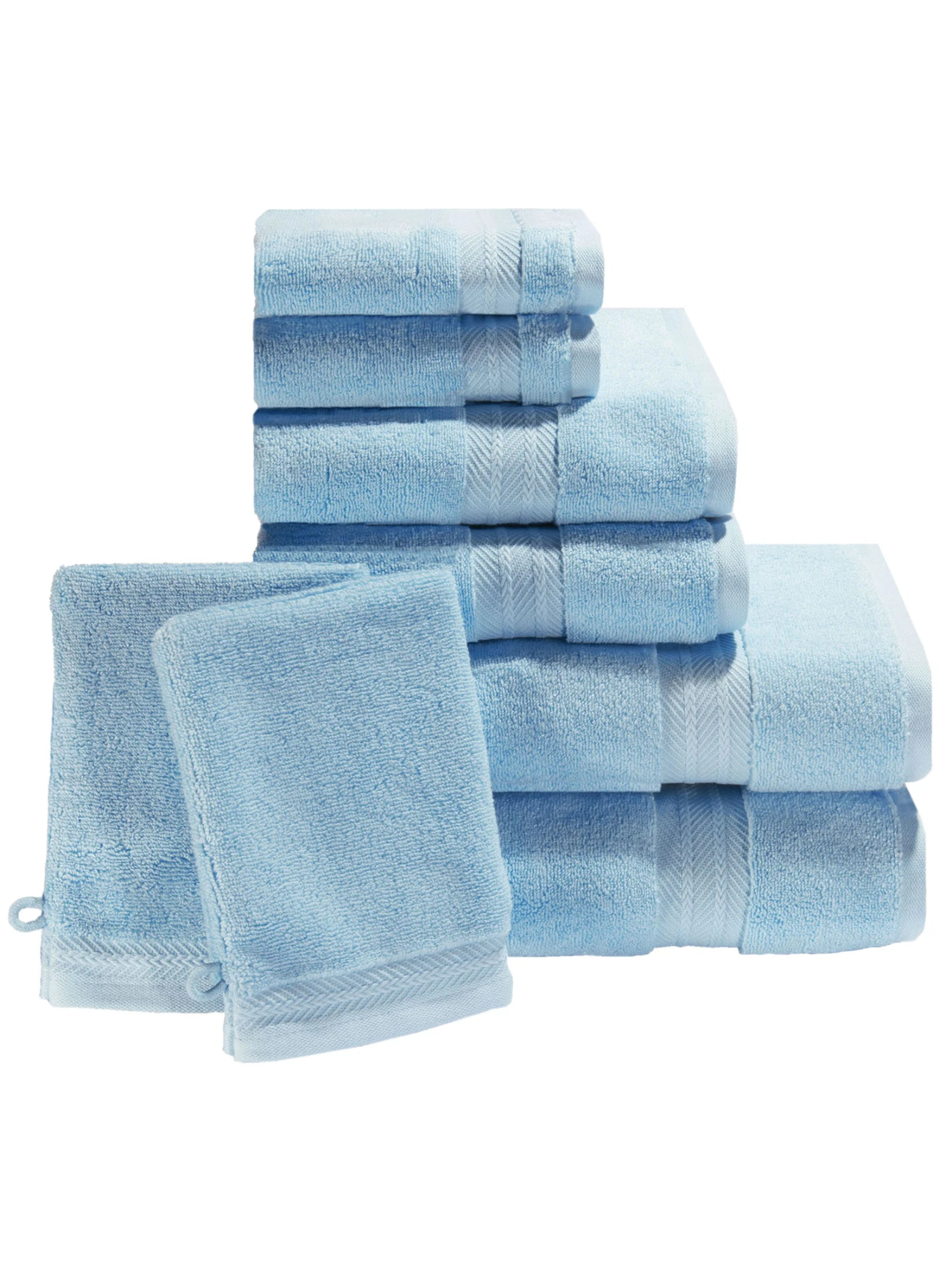 SPARTIPP: MALIBU einfarbiges 8 teiliges Spar-Set: bestehend aus zwei Handtüchern je ca. 50 x 100 cm, zwei Duschtüchern je ca. 70 x 140 cm, zwei Gästetüchern je ca. 30 x 50 cm und zwei Waschhandschuhen je ca. 16 x 22 cm.